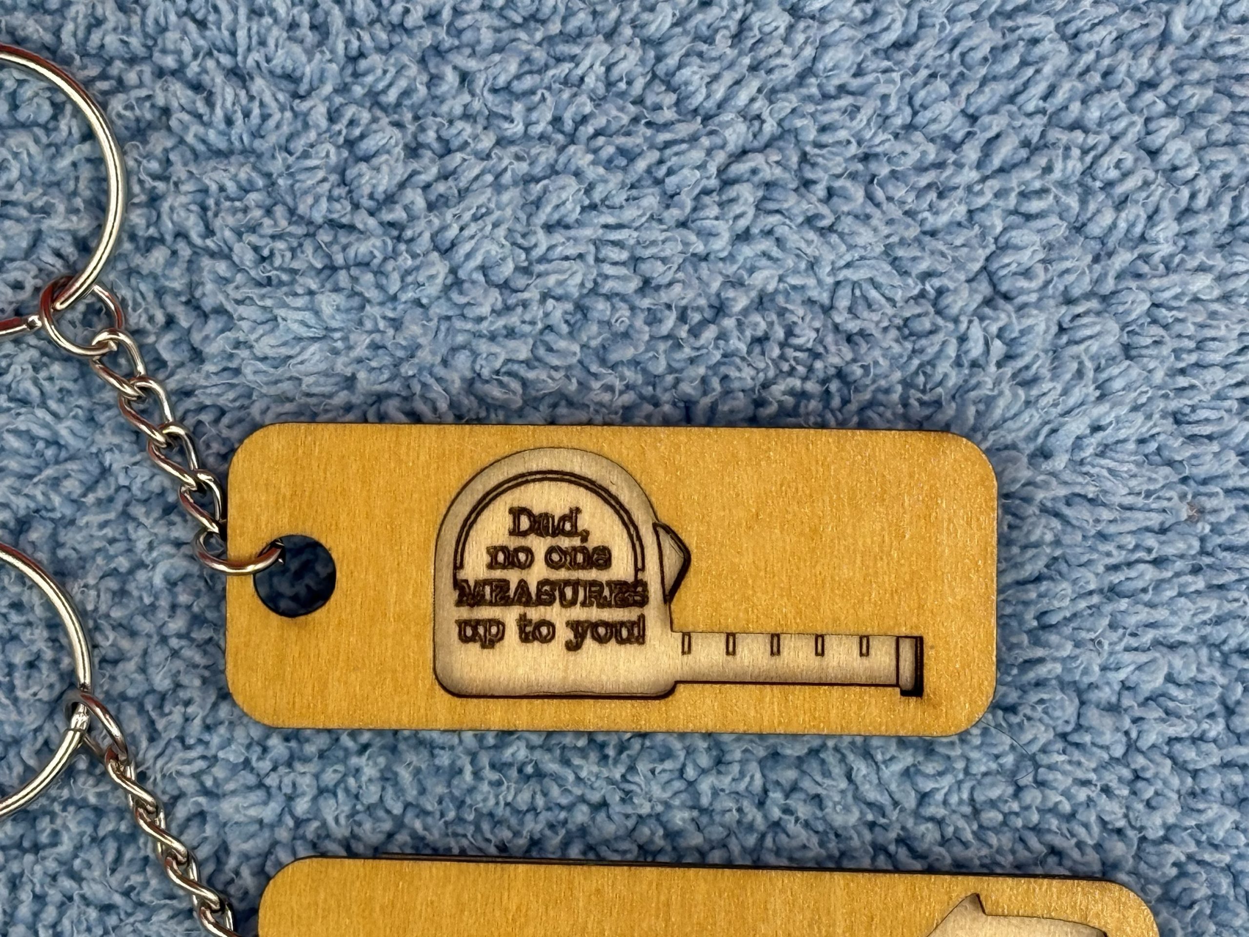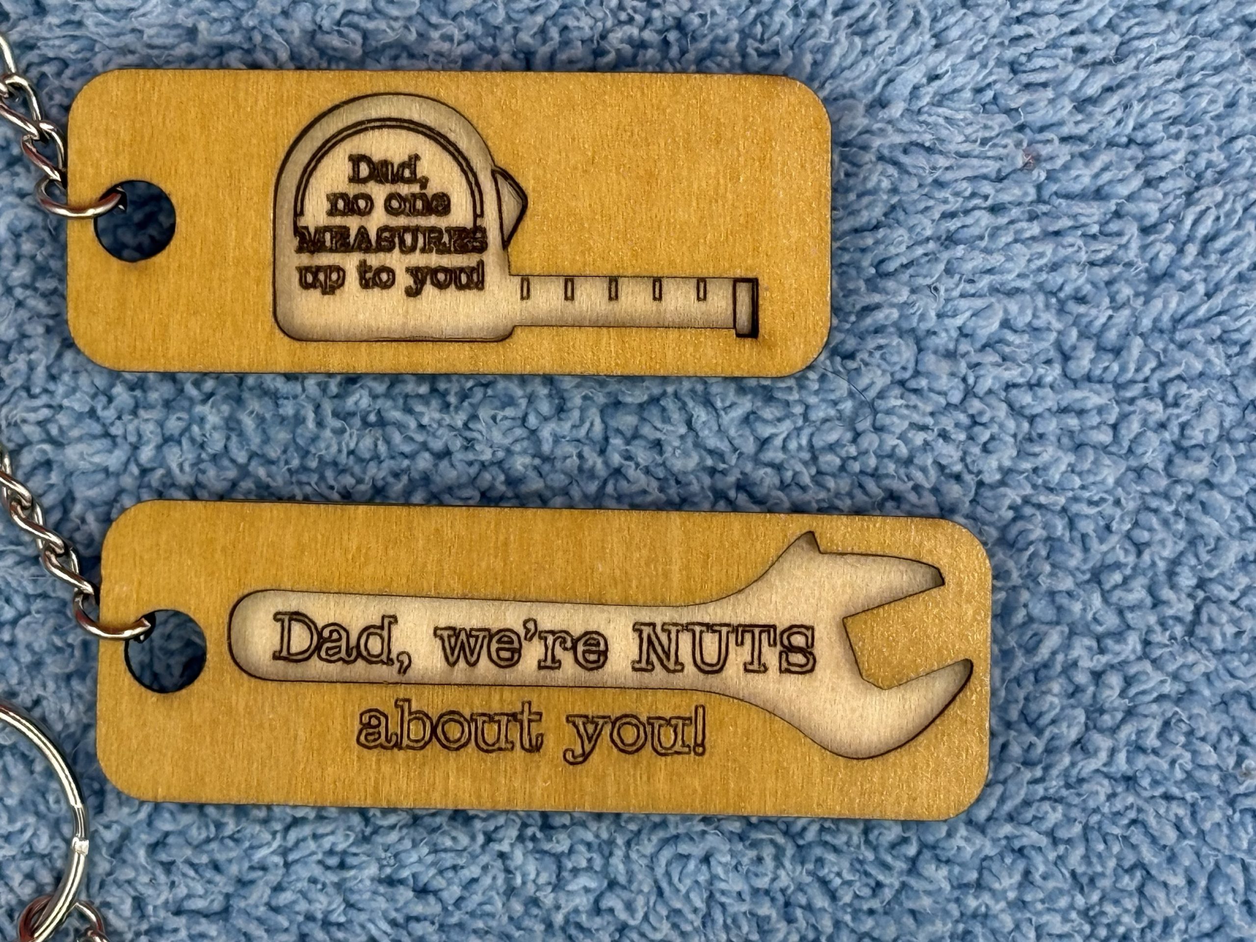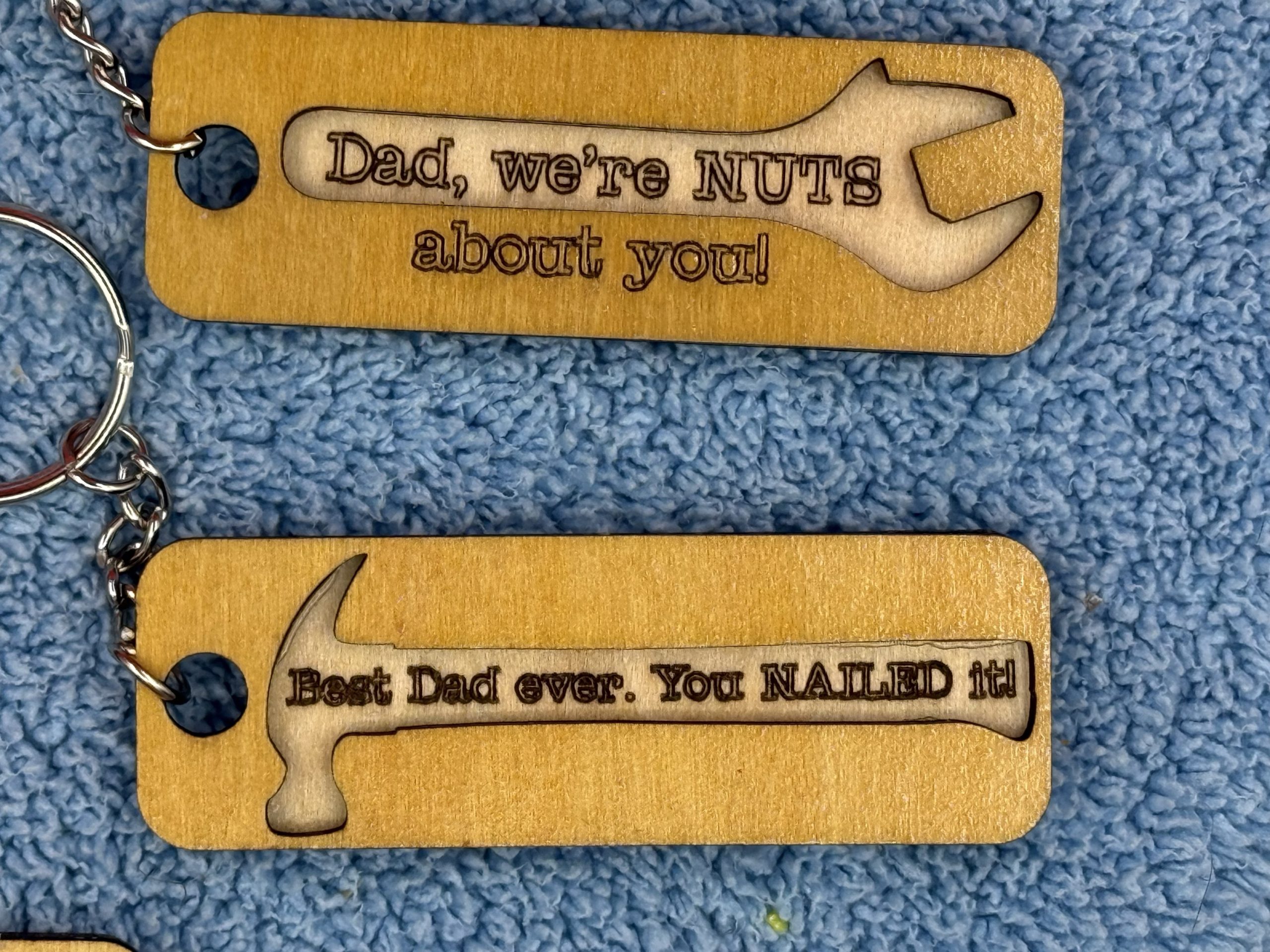 These are made of laser engraved and cut wood. The top portion has a stain and polyurethane coating. The bottom portion has a polyurethane coating but not the stain so there’s contrasting colors of wood.